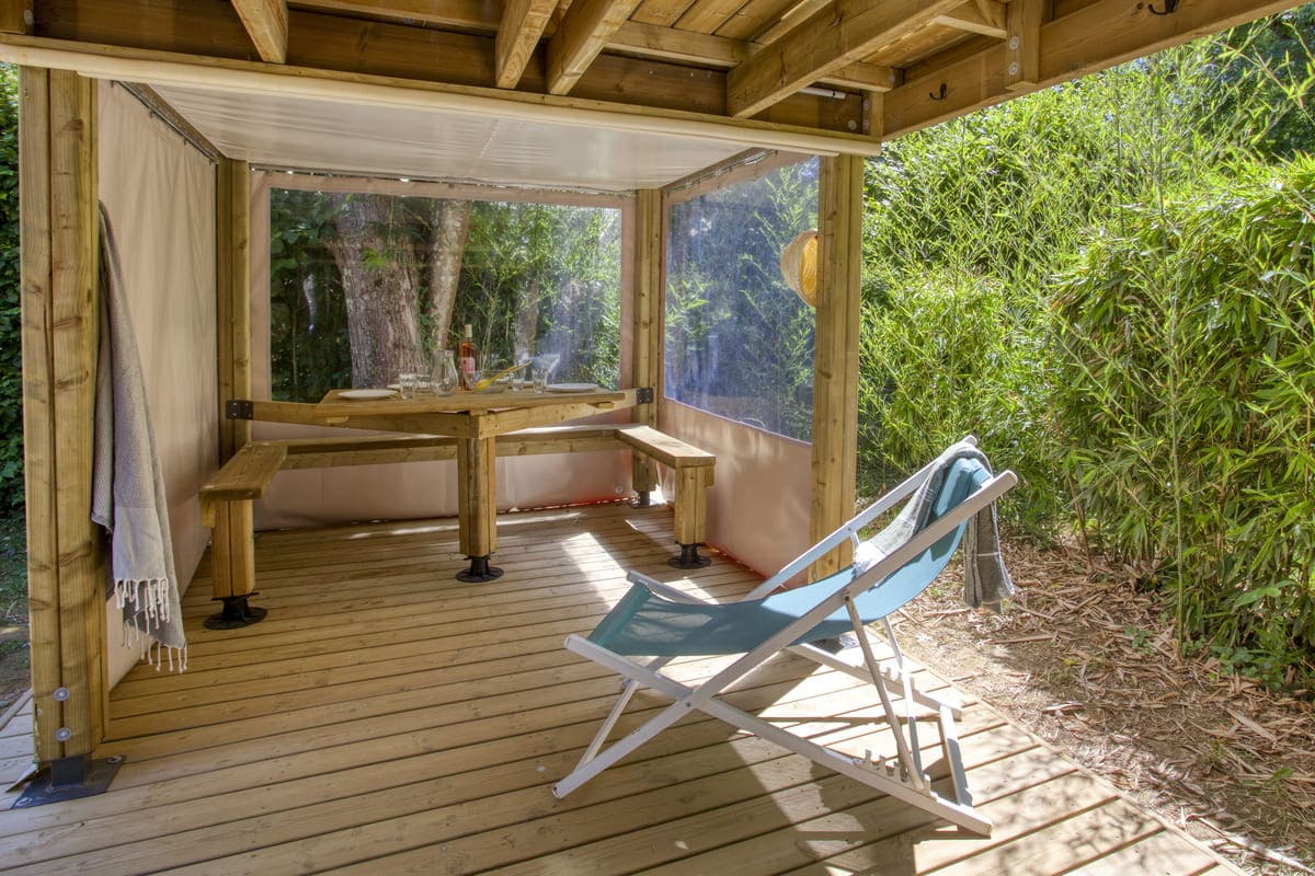 En dessous des chambres, vous trouverez un espace cuisine et coin repas spacieux et fonctionnel, parfait pour profiter de vos repas en famille. La cuisine est équipée d’un réfrigérateur avec congélateur, d’un micro-ondes, d’une plaque gaz 2 feux, d’une cafetière italienne, d’une bouilloire, ainsi que de la vaisselle nécessaire pour 4 personnes. L’espace peut être fermé grâce à des bâches pour plus de confort et d’intimité. Le coin repas est couvert et comprend une table et des bancs, permettant de prendre vos repas en toute circonstance.